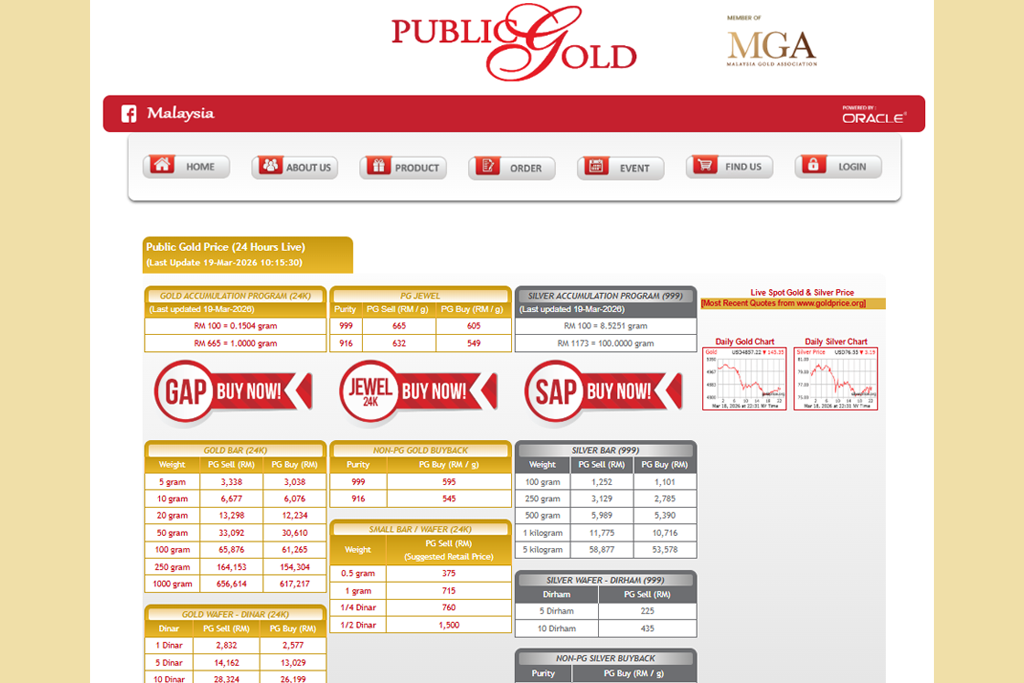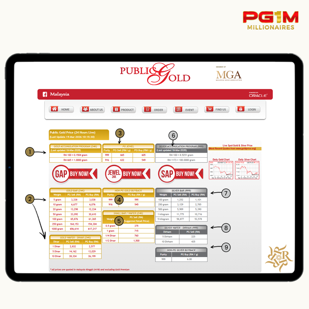Nak semak harga emas Public Gold? Sebenarnya sangat mudah. Hanya pergi ke laman web Public Gold di www.publicgold.com.my . Di situ anda boleh terus lihat harga emas terkini yang dikemaskini secara live.